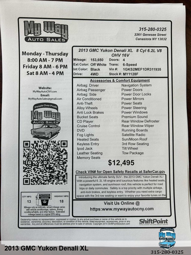 Introducing the ultimate family SUV - the 2013 GMC Yukon Denali XL! With a powerful 6. 2L V8 engine and luxurious features like heated seats, navigation system, and sun/moon roof, this vehicle is perfect for road trips or daily commutes. Safety is a top priority with multiple airbags, anti-lock brakes, and keyless entry. Whether you need extra cargo space with the 3rd row seating or want to enjoy your favorite tunes on the premium sound system, this Yukon Denali has it all. Don't miss out on this opportunity to own a reliable and stylish SUV that will turn heads wherever you go. Upgrade your ride today with this well-maintained GMC Yukon Denali XL - adventure awaits! Child Safety Door Locks, 4WD/AWD, Automatic Load-Leveling, Locking Differential, Traction Control, Vehicle Stability Control System, Electronic Parking Aid, Remote Ignition, Separate Driver/Front Passenger Climate Controls, Tachometer, Heated Steering Wheel, Leather Steering Wheel, Steering Wheel Mounted Controls, Adjustable Foot Pedals, Genuine Wood Trim, Tire Pressure Monitor, Trip Computer, AM/FM Radio, Voice Activated Telephone, Second Row Sound Controls, Telematics System, Front Cooled Seat, Front Power Lumbar Support, Passenger Multi-Adjustable Power Seat, Second Row Folding Seat, Second Row Heated Seat, Cargo Area Cover, Load Bearing Exterior Rack, Automatic Headlights, Daytime Running Lights, Front Air Dam, Power Trunk Lid, Chrome Wheels, Full Size Spare Tire, Electrochromic Exterior Rearview Mirror, Heated Exterior Mirror, Electrochromic Interior Rearview Mirror, Interval Wipers, Towing Preparation Package,Out of State, No accidents, Non-smoker, Looks & runs great, Power everything, GPS system, Satellite radio, Back up camera, Very clean interior, Fully loaded, 4WD, Call George 3, One, 5-4, One, 5, Five, 0, Six, 1, Call Justin 3, One, 5-7, Nine, 5-7, Four, 4, Nine, Call Mechelle 3, One, 5-7, Six, 1 - Seven, 2 , Six, 9, Call Scott 3, One, 5-3, Four, 5, Five, 5, One, 9, Financing options available, First time buyer's program available