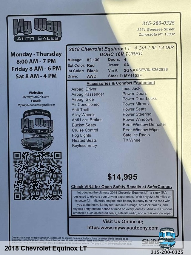 Introducing the ultimate 2018 Chevrolet Equinox LT - a sleek SUV designed to elevate your driving experience. With only 82,130 miles on its powerful 1. 5L turbo engine, this beauty is ready to hit the road with you at the helm. Safety features like airbags, anti-lock brakes, and keyless entry ensure peace of mind on every journey. And with luxurious amenities such as heated seats, satellite radio, and a rear window wiper, you'll never want to leave the driver's seat. Don't miss out on this incredible opportunity to own a top-of-the-line vehicle at an unbeatable price. Upgrade your commute and make everyday adventures unforgettable in the Chevrolet Equinox LT. Visit us today to test drive this stunning SUV and experience true driving excellence firsthand!Out of State, Non-smoker, No accidents, AWD, Back up camera, Satellite radio, Very clean interior, Looks & runs great, Financing options available, Call George 3, One, 5-4, One, 5, Five, 0, Six, 1, Call Justin 3, One, 5-7, Nine, 5-7, Four, 4, Nine, Call Mechelle 3, One, 5-7, Six, 1 - Seven, 2 , Six, 9, Call Scott 3, One, 5-3, Four, 5, Five, 5, One, 9