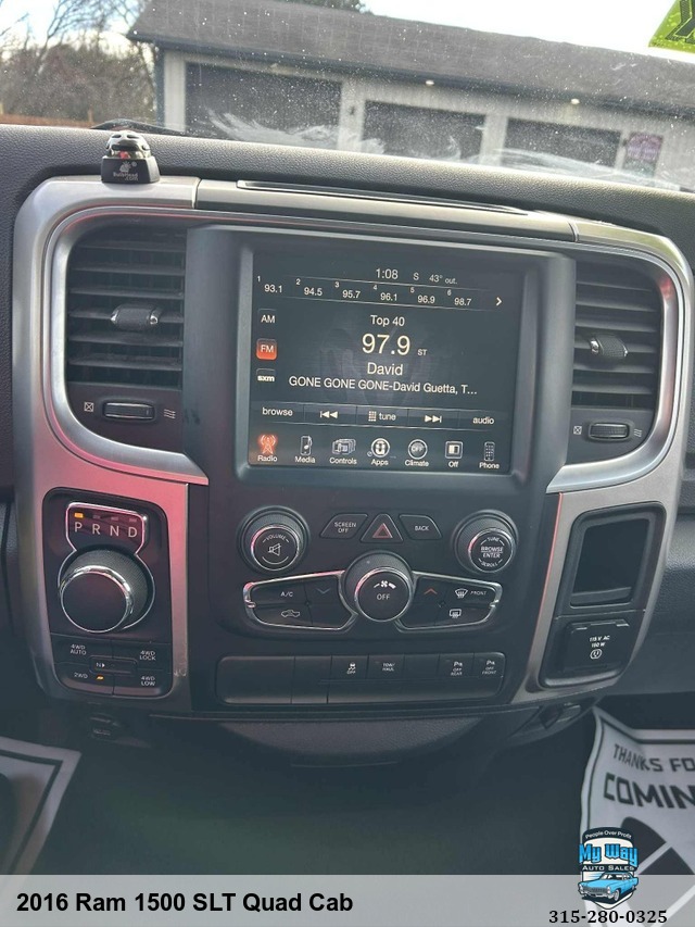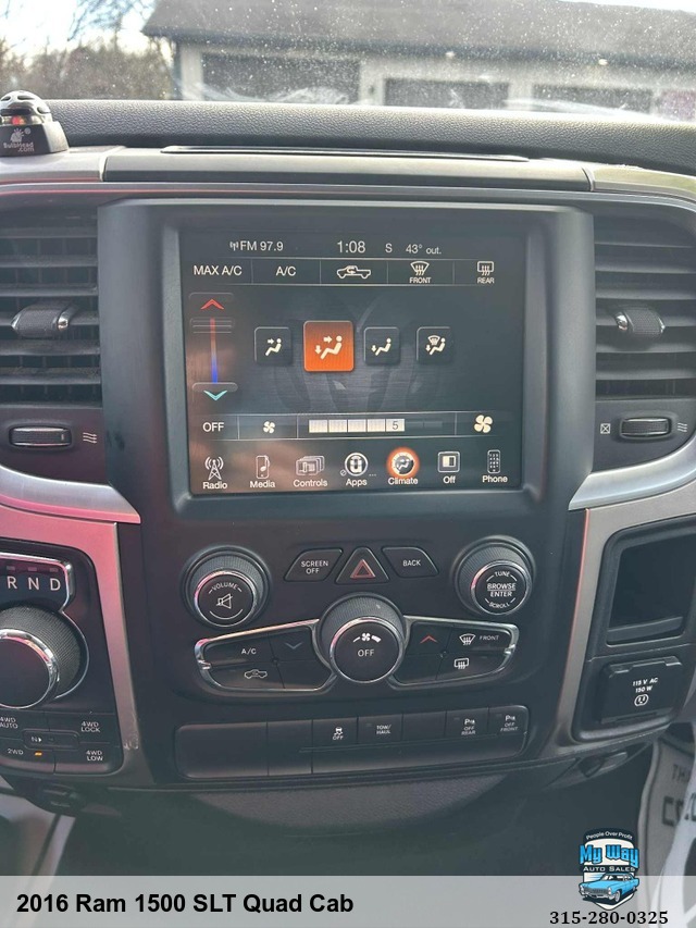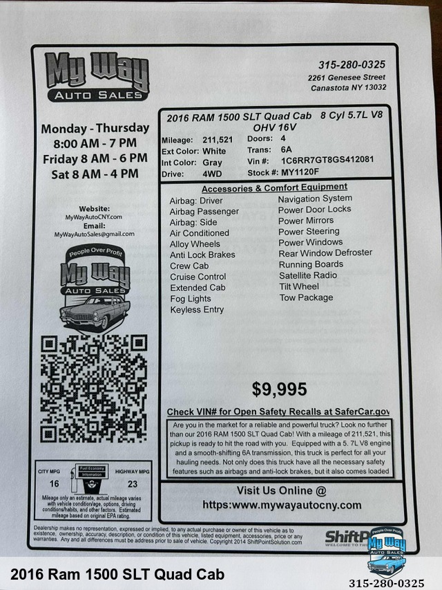 Are you in the market for a reliable and powerful truck? Look no further than our 2016 RAM 1500 SLT Quad Cab! With a mileage of 211,521, this pickup is ready to hit the road with you. Equipped with a 5. 7L V8 engine and a smooth-shifting 6A transmission, this truck is perfect for all your hauling needs. Not only does this truck have all the necessary safety features such as airbags and anti-lock brakes, but it also comes loaded with convenient options like navigation system, keyless entry, and satellite radio. Whether you're cruising down the highway or navigating through tough terrain, this RAM 1500 has got you covered. Don't miss out on this amazing deal - contact us today to schedule a test drive and see for yourself why this truck is perfect for you! 4WD, Back up camera, No accidents, Satellite radio, Must see, Financing options available, First time buyer's program available , Call George 3, One, 5-4, One, 5, Five, 0, Six, 1, Call Justin 3, One, 5-7, Nine, 5-7, Four, 4, Nine, Call Mechelle 3, One, 5-7, Six, 1 - Seven, 2 , Six, 9, Call Scott 3, One, 5-3, Four, 5, Five, 5, One, 9, View our inventory at www.mywayautocny.com