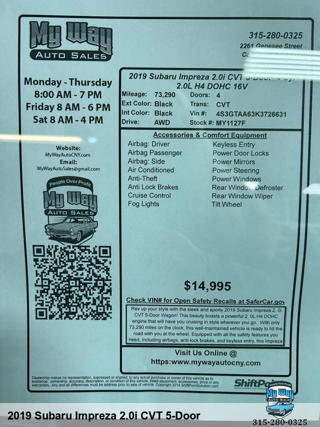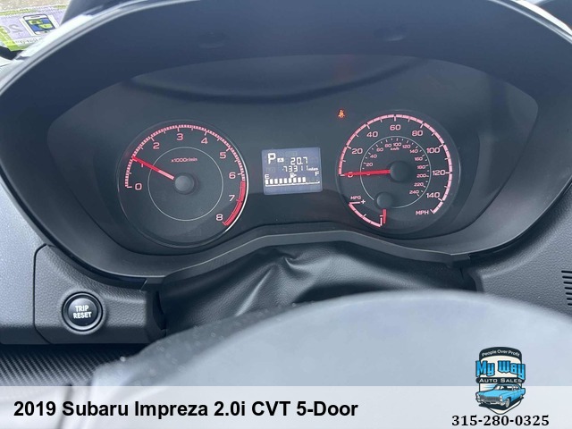 Rev up your style with the sleek and sporty 2019 Subaru Impreza 2. 0i CVT 5-Door Wagon! This beauty boasts a powerful 2. 0L H4 DOHC engine that will have you cruising in style wherever you go. With only 73,290 miles on the clock, this well-maintained vehicle is ready to hit the road with you at the wheel. Equipped with all the safety features you need, including airbags, anti-lock brakes, and keyless entry, this Impreza has got your back on every journey. Plus, enjoy added convenience with power windows, mirrors, and steering. Don't miss out on this fantastic opportunity to own a top-of-the-line Subaru at an unbeatable price. Upgrade your ride today and experience true driving excellence in the impressive Impreza! AWD, Back up camera, No accidents, One owner, Out of State, New car trade, Financing options available, First time buyer's program available , Very clean interior, Call George 3, One, 5-4, One, 5, Five, 0, Six, 1, Call Justin 3, One, 5-7, Nine, 5-7, Four, 4, Nine, Call Mechelle 3, One, 5-7, Six, 1 - Seven, 2 , Six, 9, Call Scott 3, One, 5-3, Four, 5, Five, 5, One, 9, View our inventory at www.mywayautocny.com