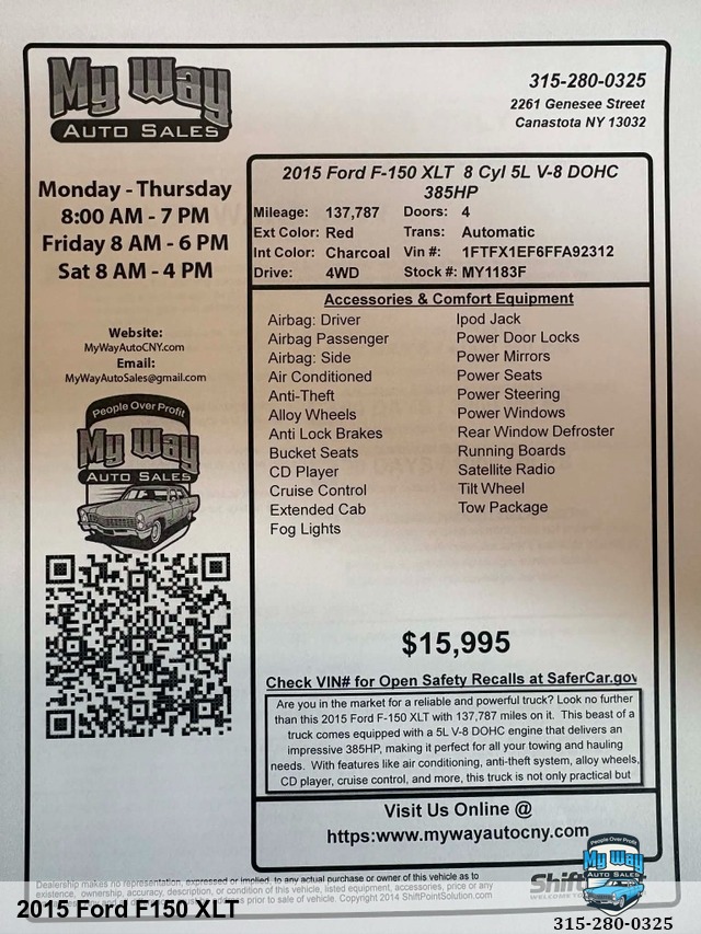 Are you in the market for a reliable and powerful truck? Look no further than this 2015 Ford F-150 XLT with 137,787 miles on it. This beast of a truck comes equipped with a 5L V-8 DOHC engine that delivers an impressive 385HP, making it perfect for all your towing and hauling needs. With features like air conditioning, anti-theft system, alloy wheels, CD player, cruise control, and more, this truck is not only practical but also comfortable to drive. Whether you need a workhorse for your job or simply want a dependable vehicle for everyday use, this Ford F-150 has got you covered. Don't miss out on the opportunity to own this fantastic truck - contact us today to schedule a test drive! 4WD, Out of State, Back up camera, Looks & runs great, Must see, Runs drives great, Satellite radio, Very clean interior, Financing options available, First time buyer's program available , Call George 3, One, 5-4, One, 5, Five, 0, Six, 1, Call Justin 3, One, 5-7, Nine, 5-7, Four, 4, Nine, Call Mechelle 3, One, 5-7, Six, 1 - Seven, 2 , Six, 9, Call Scott 3, One, 5-3, Four, 5, Five, 5, One, 9, View our inventory at www.mywayautocny.com