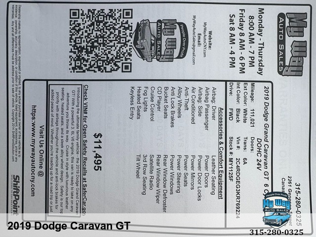 Introducing the ultimate family vehicle - the 2019 Dodge Grand Caravan GT! With a powerful 3. 6L V6 engine, this van is ready to take on any adventure you throw its way. Cruise in style with luxurious leather seating, heated seats, and a sleek alloy wheel design. Safety is our top priority with airbags throughout the vehicle and anti-lock brakes for added peace of mind. Whether you're loading up for a road trip or just running errands around town, this Grand Caravan has all the features you need to make every drive comfortable and convenient. Don't miss out on this incredible deal - upgrade your ride today and experience the luxury of owning a Dodge Grand Caravan GT. Drive away in confidence knowing that this reliable van will get you where you need to go safely and in style. FWD, Out of State, Power everything, Very clean interior, Financing options available, First time buyer's program available , Back up camera, Call George 3, One, 5-4, One, 5, Five, 0, Six, 1, Call Justin 3, One, 5-7, Nine, 5-7, Four, 4, Nine, Call Mechelle 3, One, 5-7, Six, 1 - Seven, 2 , Six, 9, Call Scott 3, One, 5-3, Four, 5, Five, 5, One, 9, View our inventory at www.mywayautocny.com