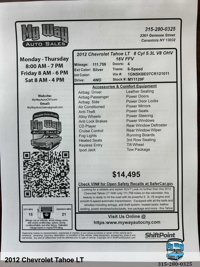 Looking for a reliable and stylish SUV? Look no further than this 2012 Chevrolet Tahoe LT! With only 111,759 miles on the odometer, this beauty is ready to hit the road with its powerful 5. 3L V8 engine and smooth 6-speed automatic transmission. Equipped with all the bells and whistles including airbags, anti-theft system, heated seats, leather seating, power windows/locks/seats, tow package and more - this Tahoe has everything you need for your next adventure. Whether you're cruising around town or heading off-road for a weekend getaway, this truck has got you covered. Don't miss out on the opportunity to own this incredible vehicle - contact us today to schedule a test drive before it's gone! 4WD, No accidents, Out of State, Financing options available, First time buyer's program available , Call George 3, One, 5-4, One, 5, Five, 0, Six, 1, Call Justin 3, One, 5-7, Nine, 5-7, Four, 4, Nine, Call Mechelle 3, One, 5-7, Six, 1 - Seven, 2 , Six, 9, Call Scott 3, One, 5-3, Four, 5, Five, 5, One, 9, View our inventory at www.mywayautocny.com
