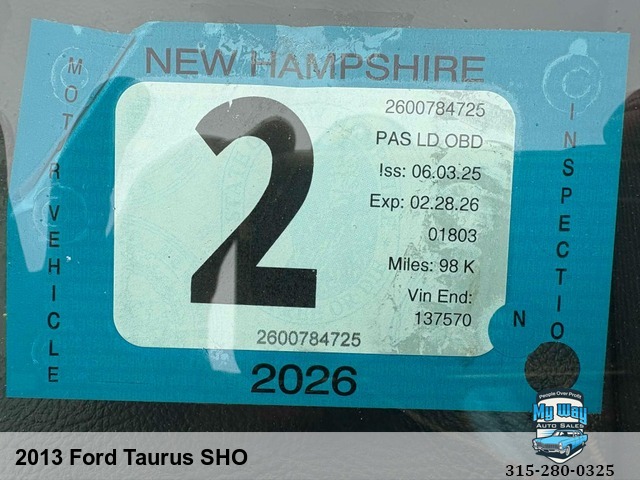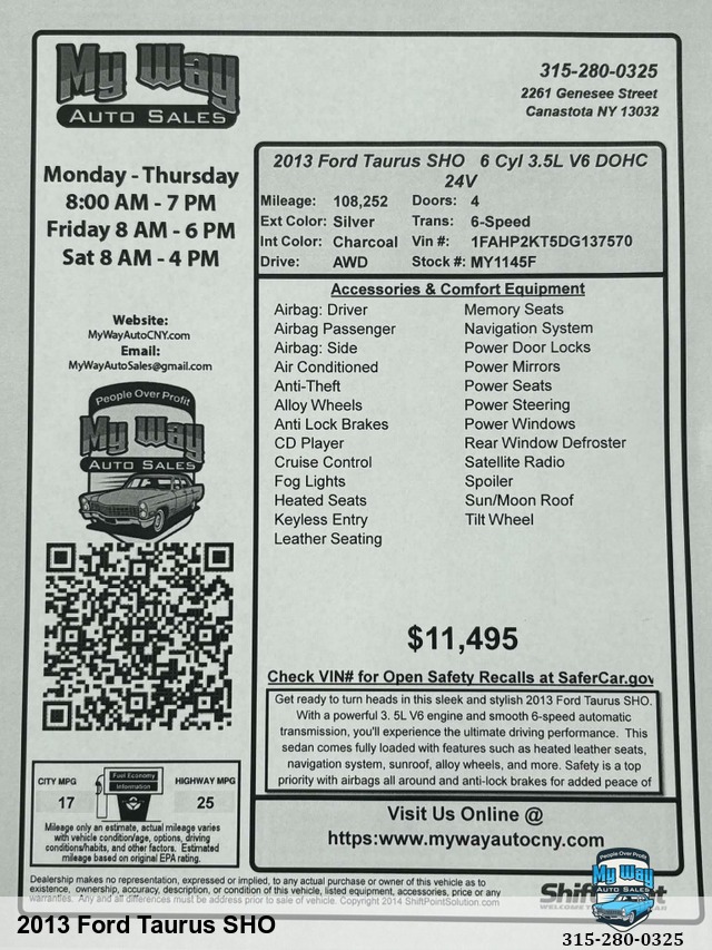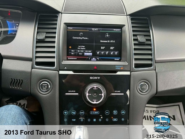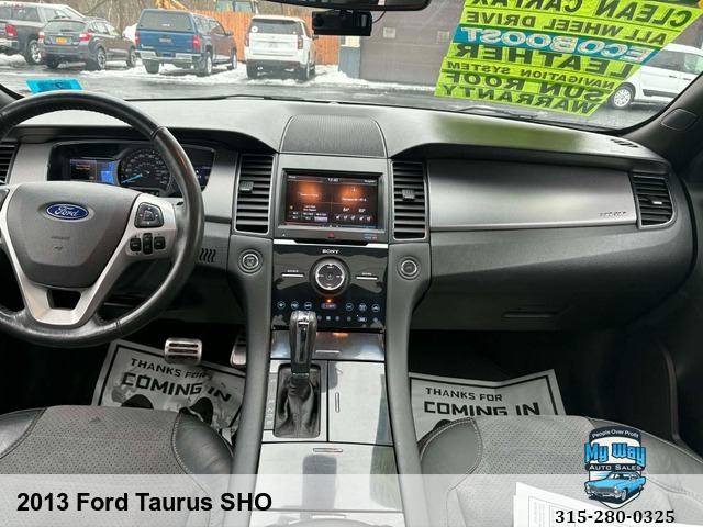 Get ready to turn heads in this sleek and stylish 2013 Ford Taurus SHO. With a powerful 3. 5L V6 engine and smooth 6-speed automatic transmission, you'll experience the ultimate driving performance. This sedan comes fully loaded with features such as heated leather seats, navigation system, sunroof, alloy wheels, and more. Safety is a top priority with airbags all around and anti-lock brakes for added peace of mind on the road. Whether you're cruising down the highway or navigating through city streets, this Taurus offers comfort, convenience, and luxury all in one package. Don't miss out on your chance to own this impressive vehicle. Upgrade your ride today with the 2013 Ford Taurus SHO - it's more than just a car, it's a statement of style and sophistication. Child Safety Door Locks, 4WD/AWD, Traction Control, Vehicle Stability Control System, Electronic Parking Aid, Trunk Anti-Trap Device, Remote Ignition, Separate Driver/Front Passenger Climate Controls, Tachometer, Leather Steering Wheel, Steering Wheel Mounted Controls, Telescopic Steering Column, Adjustable Foot Pedals, Tire Pressure Monitor, Trip Computer, AM/FM Radio, Telematics System, Front Power Lumbar Support, Passenger Multi-Adjustable Power Seat, Second Row Folding Seat, Cargo Net, Automatic Headlights, High Intensity Discharge Headlights, Front Air Dam, Electrochromic Exterior Rearview Mirror, Heated Exterior Mirror, Electrochromic Interior Rearview Mirror, Interval Wipers, AWD, Back up camera, No accidents, Out of State, Runs drives great, GPS system, Must see, New car trade, Satellite radio, Very clean interior, Financing options available, First time buyer's program available , Call George 3, One, 5-4, One, 5, Five, 0, Six, 1, Call Justin 3, One, 5-7, Nine, 5-7, Four, 4, Nine, Call Mechelle 3, One, 5-7, Six, 1 - Seven, 2 , Six, 9, Call Scott 3, One, 5-3, Four, 5, Five, 5, One, 9, View our inventory at www.mywayautocny.com